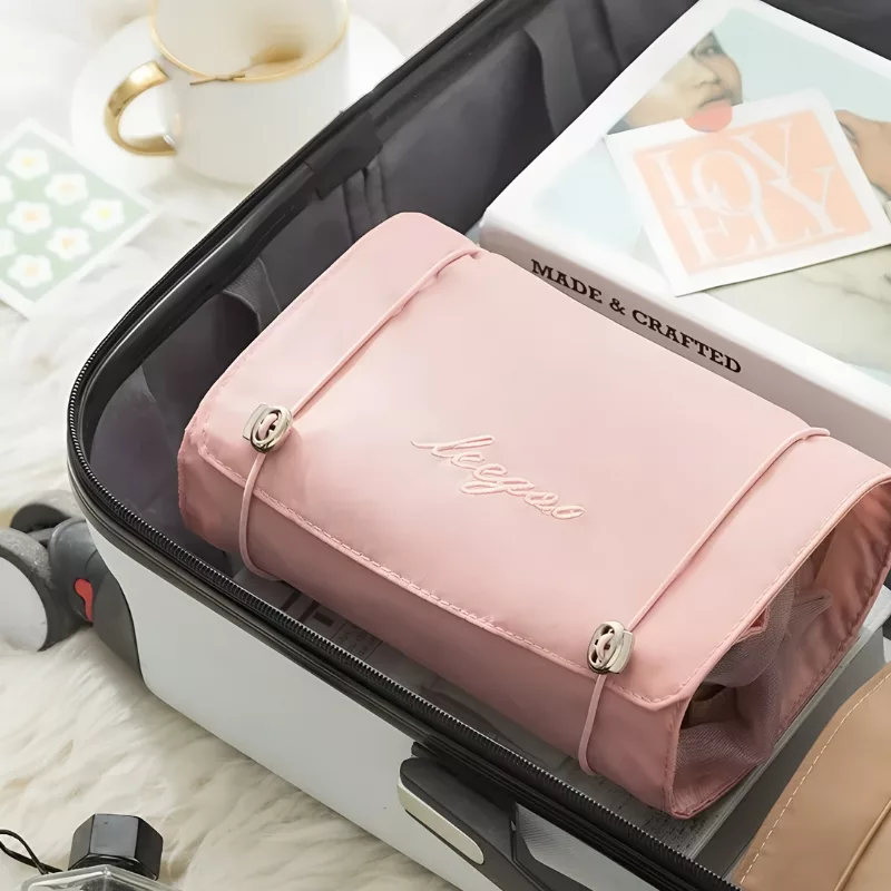 Deze opvouwbare make-uptas kan worden bevestigd aan deuren, handdoekstangen of haken. Dit maakt de inhoud gemakkelijk te zien en te pakken en helpt ruimte op de toonbank te besparen.